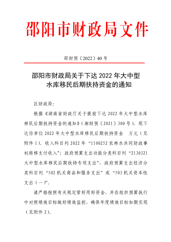 附件:1、2022年度中央大中型水库移民后期扶持项目资金安排表