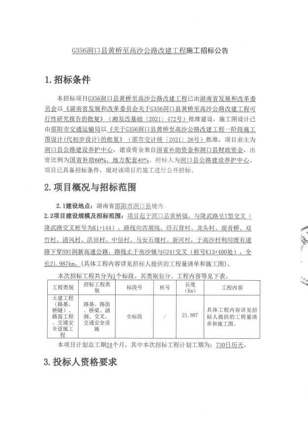 文件名称: G356洞口县黄桥至高沙公路改建工程施工招标公告